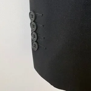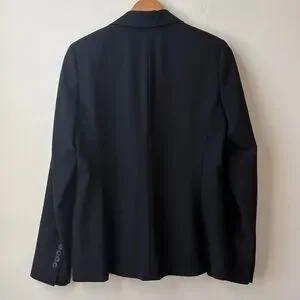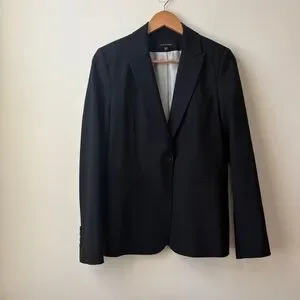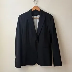 This polished blazer will have you feeling your best from morning meetings to evening events and is cut in refined, lightweight wool. Single button closure, notched collar, 4 buttons on sleeves & 2 front welt pockets(still sewn up). Lined with a striped pattern. 98% Wool, 2% Elastane