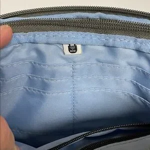 Compact and functional messenger bag by Baggallini. Features a sleek design with a front zipper pocket. Three zippered pocket and magnetic closure pocket in middle.