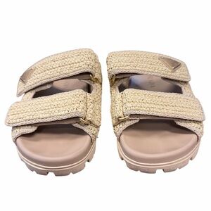 Elegant Prada slides with a woven texture. Features a tan hue and dual straps. Does not come with box or original packaging.