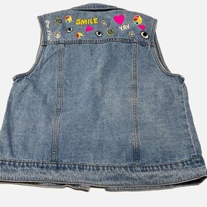 •Button down denim vest with groovy embellishments on front and back.