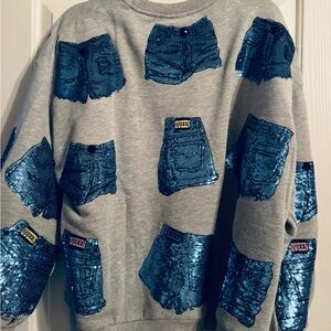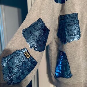 Stylish gray sweatshirt featuring a unique blue sequin design. Perfect for casual wear. Size medium and worn once