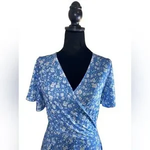 Wrap v neck, ruffle short sleeve, a line, above knee length, floral dress, material is lightweight, flowy, soft.