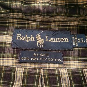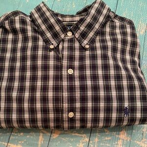 Classic plaid design with button-down collar. Features navy, white, and green pattern. The navy is dark and almost looks black but fairly certain it’s navy. It’s a great looking shirt and I even double checked with my husband if he was sure he wanted me to sell it 🤷🏻♀️. These shirts hold up over the years. I do not see any obvious flaws or signs of wear. This is likely vintage because I don’t recall him buying it and we’ve been together 18 years or so. Clearing out the closets so time to find it a new home. Measurements in photos. Smoke free, cat 🐈 🐈⬛ friendly home.