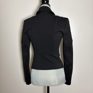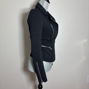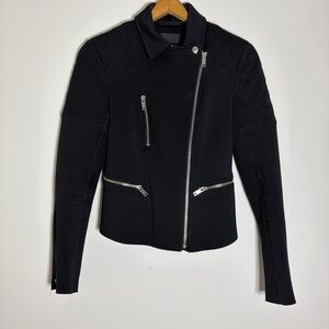 Wilfred Free black moto jacket โ€“ structured biker style with quilted shoulders and stretch ponte fabric. A sleek Aritzia classic. A chic Wilfred Free moto jacket from Aritzia featuring a modern fitted silhouette with quilted shoulder panels and asymmetric zip closure. The structured ponte-style fabric gives the look of a classic biker jacket while remaining comfortable and flexible. A versatile layering piece that pairs effortlessly with denim, dresses, or tailored trousers for a polished elevated day or street style look. Raw hems. Neoprene like feel, stretch. ๐Ÿ“ Sizing Info Tag size: 0 (XS) Flat lay measurements *has stretch* pictured on size 5/6 mannequin Pit to pit: 16.5โ€ Waist: 14.5โ€ โœจ Condition Excellent pre-owned condition with no visible flaws. ๐Ÿ”‘ Keywords Wilfred Free moto jacket, Aritzia biker jacket, black moto jacket women, quilted shoulder jacket, minimalist biker jacket, edgy capsule wardrobe, fitted moto jacket, street style jacket, elevated casual jacket, structured ponte jacket ๐Ÿ”– Style Collection: HOL-ED Explore more in this collection by searching HOL-ED Sku: R 0326