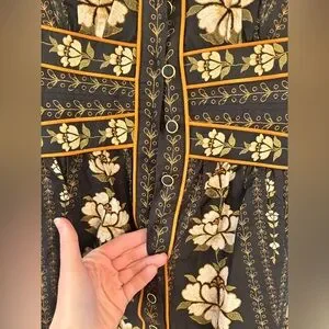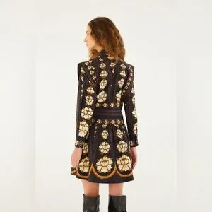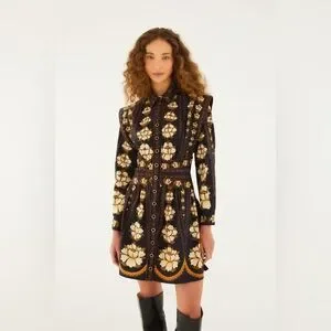 Embrace playful elegance with this mini dress crafted from 100% certified organic cotton, showcasing a rich black canvas adorned with warm, intricate flowers. The structured collar neckline and long sleeves blend sophistication with charm, while the bold shoulders and cinched waist create a flattering silhouette. This dress captures FARM Rio’s signature vibrancy, offering an artful fusion of sustainability and bold, timeless beauty.