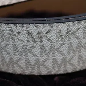 Michael Kors Women's Vanilla Logo Signature Print Faux Leather, Square Gold Buckle Belt, Size Large, White/Gray Signature, Tan Interior, 44 Inch Length, 1 3/8" Width