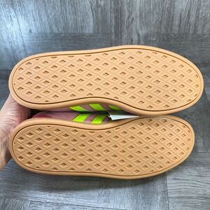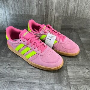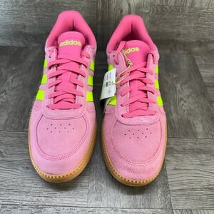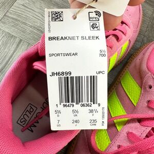 BRAND NEW. NO ORIGINAL BOX. Adidas Breaknet Sleek sneakers in a vibrant pink and neon yellow colorway. These low-top shoes feature a soft suede upper with the iconic three-stripe design in a contrasting neon lime green. Designed with a classic gum rubber outsole for a retro-inspired look, they include a padded collar and tongue for comfort. The heel counter is accented with a textured pink panel and neon yellow logo detail, making these a standout choice for casual sportswear.