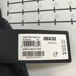Hangtag information: Oakley Take Pro Pant 3.0, color Blackout code 02E, size 28, style code FOA401403, Oakley website address, printed barcodes, RFID symbol, and listed prices 75.00 USD and 90.00 CAD.