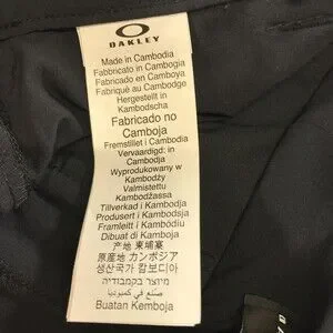Inner tag information: Oakley Regular Fit branding, CA#35460 RN#96548, Since 1975, size US/EU 28 JPN 30, numeric size 28 with 165/64Y code, external fabric 89% polyamide 11% elastane, pockets 100% polyester, multi-language made in Cambodia text.