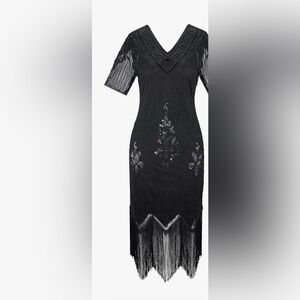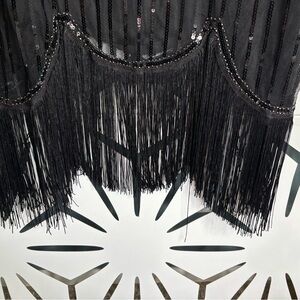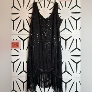 Brand new with tags (NWT) 1920s Gatsby-inspired flapper dress in black, size 3XL. Features intricate paisley sequin detailing and fringe accents that move beautifully with every step.