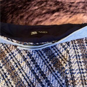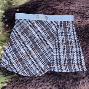 Chic tweed mini skirt with a stylish blue and brown pattern. Features a buttoned waistband for a modern look.