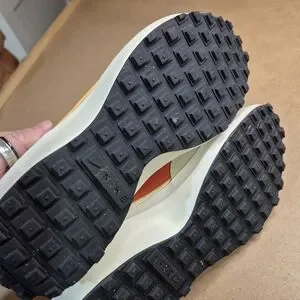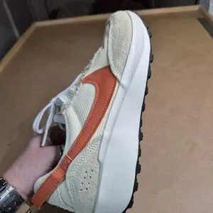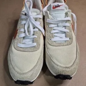 Stylish Nike women's sneakers. Cream base with vibrant orange accents. Comfortable and trendy design. New without tags or box