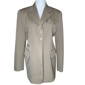 Features: Stunning vintage Kinu by Mitsu structured blazer in a versatile sand/beige tone. Crafted from high-quality 100% wool with a smooth lining. This piece features a unique modern edge with functional silver zipper details on the chest and hip pocket.