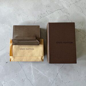 A beautifully minimal Louis Vuitton compact wallet crafted from the brand’s signature Epi leather in a rich brown tone. This elegant vintage piece features a distinctive elastic band closure with embossed Louis Vuitton logo tab across the front. The wallet opens to a practical tri-fold interior with card storage, compartments for folded bills, and a dedicated snap coin pocket for organization. A timeless Louis Vuitton small leather good that combines refined design with everyday functionality.