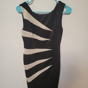 This elegant sleeveless dress features a striking black and cream design, perfect for any occasion. Its sophisticated style makes it a versatile addition to your wardrobe.