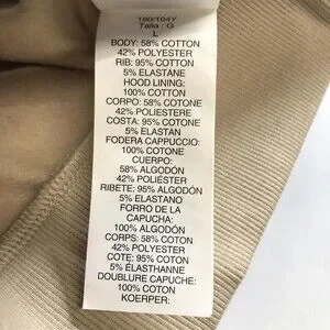 Material: Body 58% cotton and 42% polyester; rib 95% cotton and 5% elastane (spandex); hood lining 100% cotton as listed on interior fabric tag.