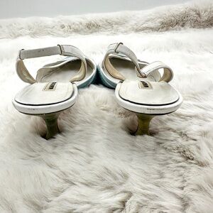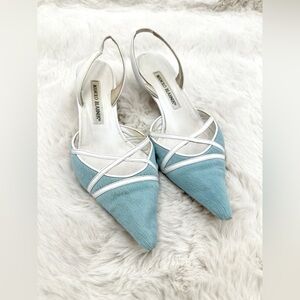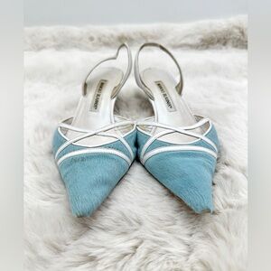 RARE Manolo Blahnik light blue pony hair leather lace-up slingback heels 37 US 7