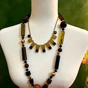 Gorgeous Smokey black and camel glass necklace on 12k plated chain.