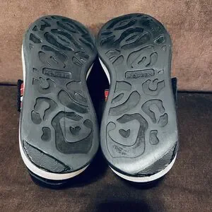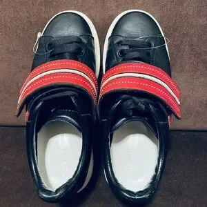 These are a rare and unique sneaker with a studded black and red strap that fastened over the normal shoelace system.