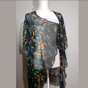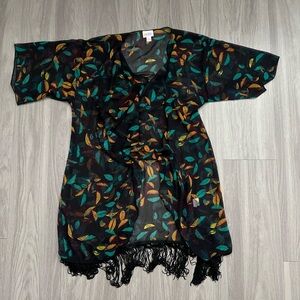Stylish LuLaRoe kimono. Black base with teal and orange leaf design. Fringe detail at hem.