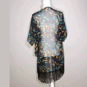 Lightweight and flowy LuLaRoe kimono in a black sheer fabric with teal and orange leaf print. Features an open front design and stylish fringe hem for a boho vibe.