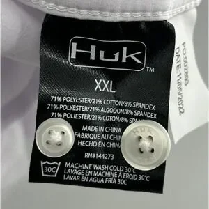 The HUK Kona Fishing Hook Performance Shirt in size 2XL is a stylish and functional button-up shirt designed for men. Made from a lightweight and breathable polyester blend fabric, this shirt features a solid white color with embroidered fishing hook accents, perfect for casual occasions like travel or parties. The collared neckline and button-down collar style add a classic touch, while the short sleeves make it ideal for summer, spring, and winter wear. With features like pockets and machine washable care instructions, this shirt combines comfort and practicality for the modern fisherman.