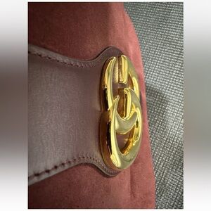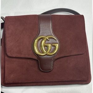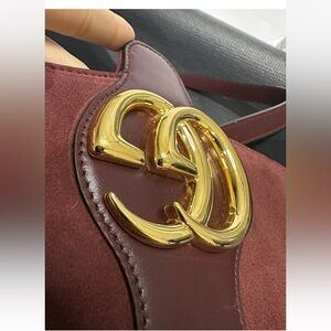 Elegant and timeless piece from Gucci, crafted in rich burgundy suede with gold-tone hardware and signature GG logo. A great addition to any luxury handbag collection.