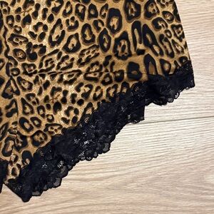 Stylish leopard print romper with black lace trim. Perfect for a bold look.