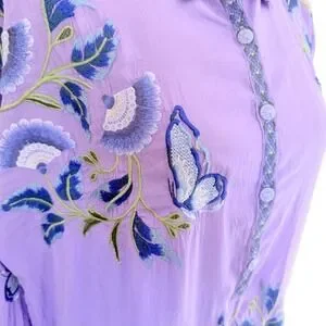 Keywords: Boho, Bohemian, Western, Coastal Cowgirl, Western Boho, Cottagecore, Whimsigothic, Embroidered, Luxury, Rayon, Butterfly, Floral, Lavender, Relaxed Fit, Coastal Grandmother, Ethereal, Artistic, Pastel, Spring, Vacation