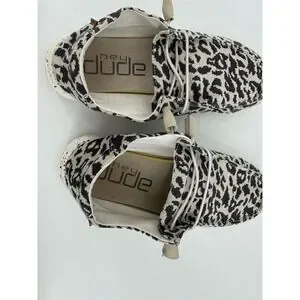 Keywords: Hey Dude, Wendy Woven, Cheetah Grey, women's casual shoes, lightweight, breathable, slip-on, round toe, trendy, spring fashion, pre-owned shoes, comfortable footwear, casual style, woven upper, cheetah pattern.