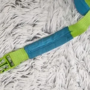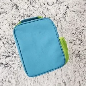 Teal and bright green lunchbag with robot print on front. Cup holder on side. A little discoloration on handle and back, as pictured.