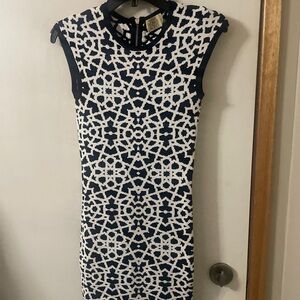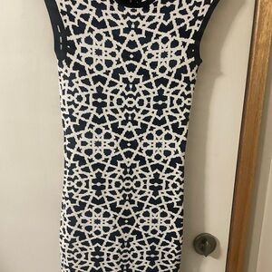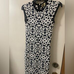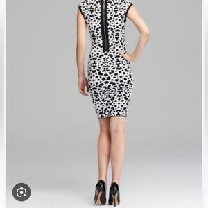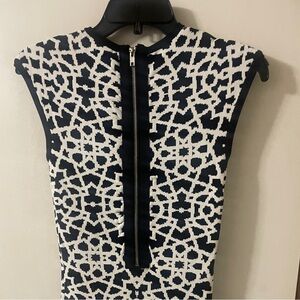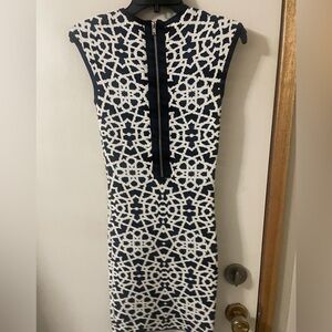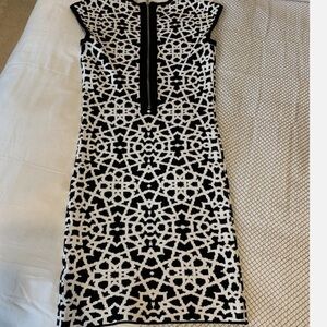 Chic round neck, body-con, mini dress with bold black and white abstract pattern. Thick flexible sweater material. Stretches to fit a range of sizes. Exposed back zipper. Perfect for stylish outings with flats or heels. Gorgeous quality high-end designer dress in perfect condition!