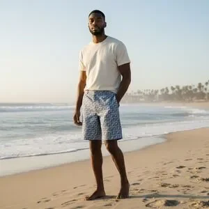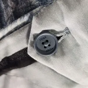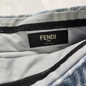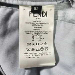 Linen shorts from Fendi showcase the iconic FF logo. Crafted in Italy from 100% linen, these lightweight bottoms feature a classic zip fly with a branded hook-and-bar closure and a clean, tailored silhouette. The blue and white colorway offers a sophisticated take on summer luxury, perfect for warm-weather styling.