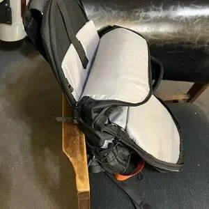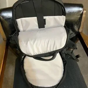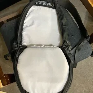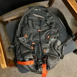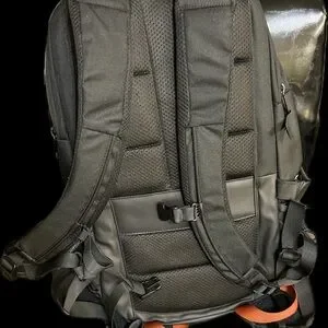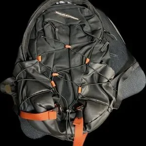 Sleek black backpack with bold orange accents. Perfect for daily adventures. Durable and functional design.