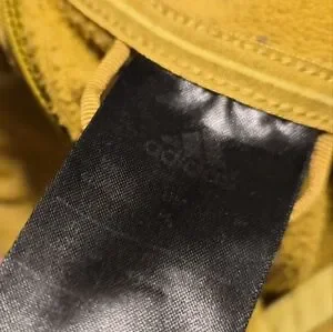 Mustard jacket with Adidas branding. Features durable fabric and secure zipper.
