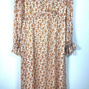 Keywords: midi dress, floral dress, long sleeve, V neck, ruffle cuffs, boho, bohemian, elegant, feminine, date night, party dress, pink lily, brown floral, white floral, pink lily