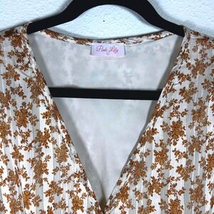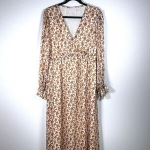 Pink Lily Floral Long Sleeve Midi Dress V Neck Ruffle Cuffs Women's