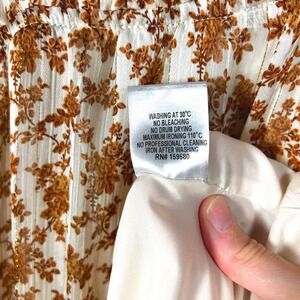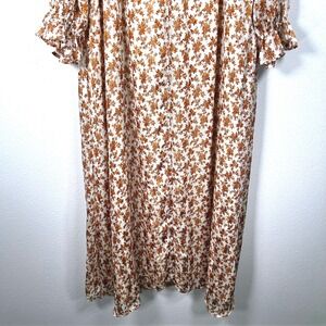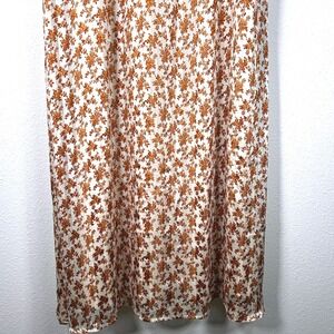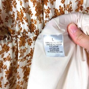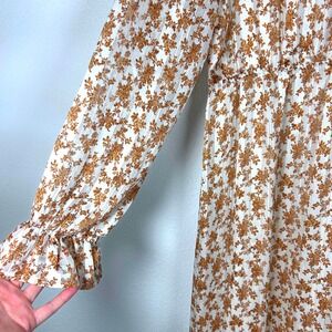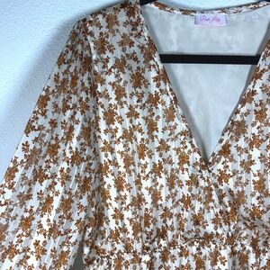 Pink Lily Boutique dress, featuring a delicate floral print in a warm, autumnal hue. Designed with a flattering V neckline and a faux wrap style at the bodice that accentuates the waistline. The long sleeves add a touch of sophistication, while the ruffle cuffs provide a playful and feminine detail. The dress is fully lined for comfort and has an elasticated waist for an easy, comfortable fit.
