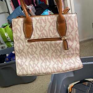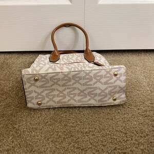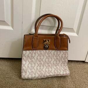 Noble + Exchange (NX) Monogram Satchel in Vanilla and Tan. This stylish handbag features an all-over NX monogram print on a vanilla background with contrasting tan faux leather accents.