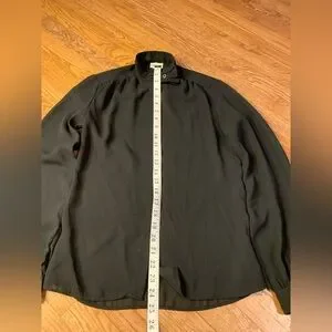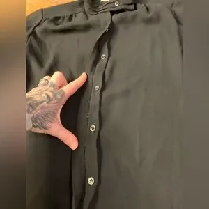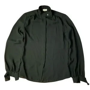 Elevate your wardrobe with this stunning vintage CAMICE blouse. Featuring a sophisticated high mock neck with a unique side-button detail and dramatic balloon sleeves, this sheer black top blends Victorian elegance with modern edge. The lightweight, slightly textured fabric creates a beautiful drape, perfect for layering over a camisole or bralette.