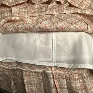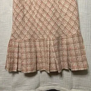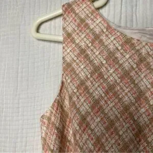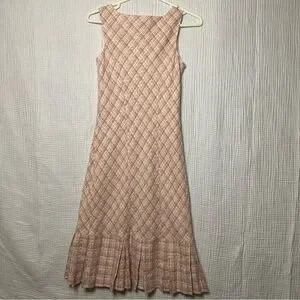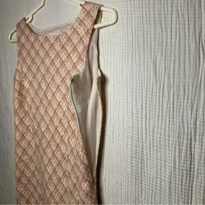The Pink Tweed Vintage Sleeveless Pleated Flounce Dress in size 4 by Chadwicks is a charming and classic piece perfect for professional settings. Made from polyester tweed, this knee-length dress features a plaid pattern, round neck, and a zipper closure. The pleated flounce detail adds a touch of femininity, making it a stylish choice for workwear or business attire. With its retro 60s-inspired theme, this dress is sure to make a statement and stand out in any wardrobe.