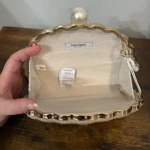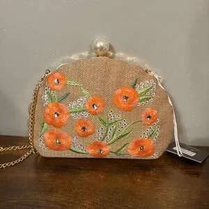 NWT Haute Hippie Clamshell Jute w/ Orange Embroidered Flowers Rhinestones Purse