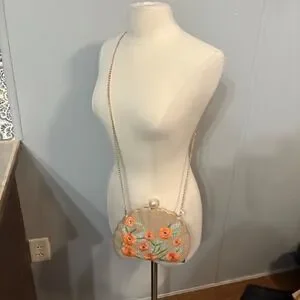 Keywords: Haute Hippie, clutch, evening bag, floral clutch, embroidered bag, chain strap, wedding clutch, party clutch, bohemian bag, beige clutch, orange flowers, formal bag, designer clutch
