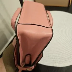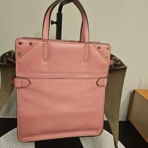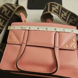 Stylish Fendi satchel in pink leather. Features a bold brown strap with logo design. Ideal for fashion-forward looks.