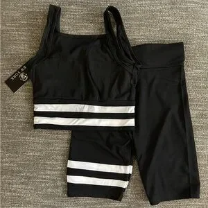 Stylish activewear set. Includes a zip-up top and biker shorts. Features bold white stripes.