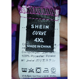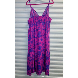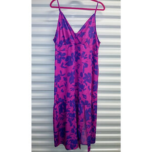 This is a floral print dress, new without tags. The dress is a vibrant pink color with a blue/purple floral pattern. It features a V-neckline and adjustable spaghetti straps. The dress has a midi length with a slit on one side. The material appears to be a lightweight polyester blend. The dress measures approximately 49 inches in length from the top of the strap and 23 inches pit to pit. No visible imperfections are noted. Marked Shein as a 4X- listed as 2X due to measurements.