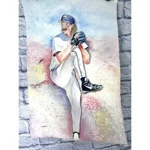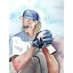 This unique piece of art is a one-of-a-kind watercolor painting signed by M.J. Devine. The artist's realistic style captures the essence of Randy Johnson, a prominent figure in Americana culture. The painting measures 22.5"T x 15"W and is unframed. The item is a single piece and was produced in 1998 using watercolor painting techniques. It features a portrait of Randy Johnson, a former baseball player for the Houston Astros. The painting is handmade and represents a contemporary period (1970-2020). The item is perfect for collectors who appreciate unique and original pieces of art.