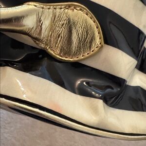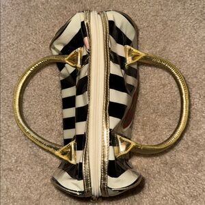 Betsey Johnson Betseyville black and white striped satchel. It is a vintage or rare item featuring a distinctive heart-shaped logo patch with the "BETSEYVILLE" text and gold-tone hardware/handles. Style: It is typically described as a satchel or bowler bag style, Material: The exterior is often made of a durable material like PVC or polyurethane, giving it a patent finish, THIS IS A VINTAGE BAG IN VERY GOOD CONDITION, there are a few color transfers shown in pictures, sold as is, all sales final.