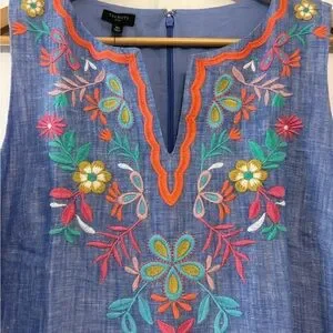 Fresh, feminine, and perfect for warm weather, this Talbots Petite sleeveless shift dress features beautiful multicolor floral embroidery along the neckline on a soft chambray-style blue fabric. A comfortable A-line silhouette and back zip closure. A great style for vacations, brunch, workwear, or summer events. Model