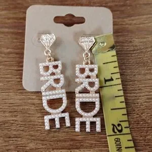 Perfect for a bachelorette party, bridal shower, rehearsal dinner, or getting ready on the big day, these eye-catching earrings feature the word "BRIDE" spelled out vertically in elegant faux seed pearls. The top post is designed as a sparkling rhinestone diamond, securely set in a shiny gold-tone backing. They are New Without Tags (NWOT) and completely unworn, ready to add the perfect finishing touch to any bridal outfit.